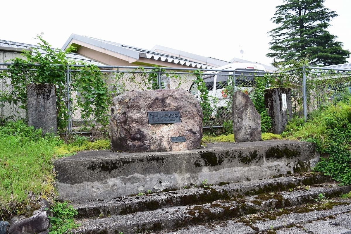 閉校記念碑は表面だけに跡地を記すプレートと、当時の町長が文字を書いたことを示すプレートの2枚がはめられている。その両脇には門柱があり、片方は当時の校名が書かれている。その間にはなぜか供養塔が建てられている。いったいこれは何を表す供養塔なのだろうか。もしかして、現施設の・・・?にしてもお粗末すぎるか。