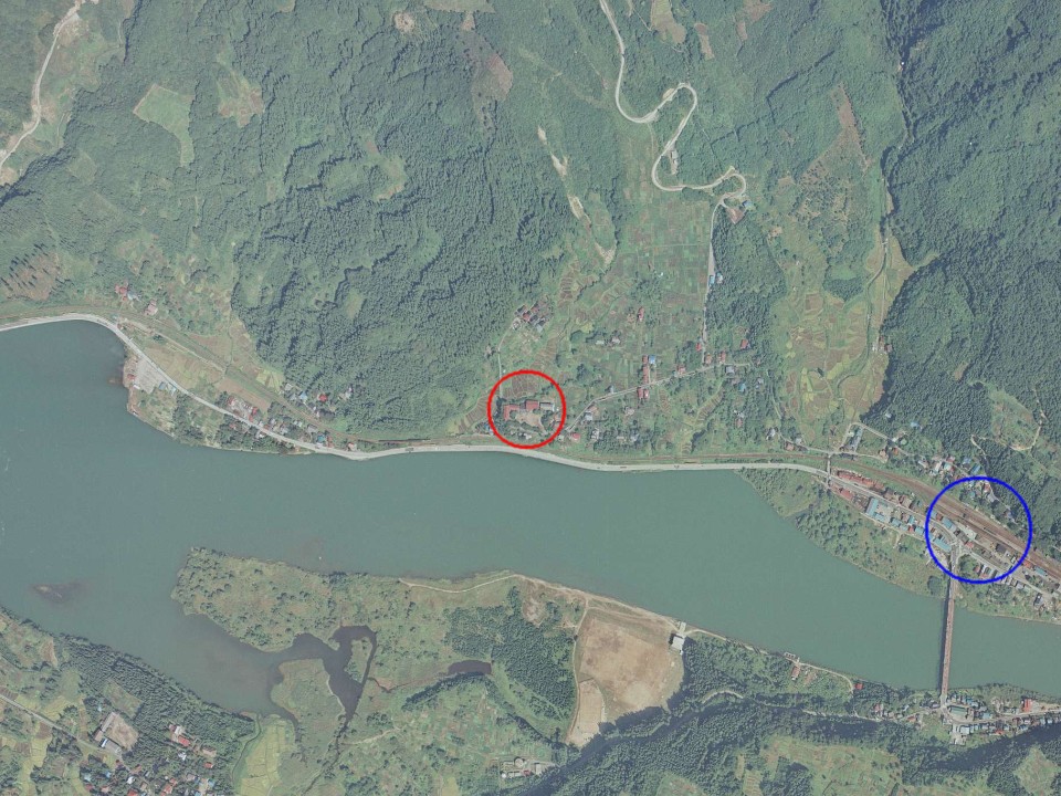 (1976年の空中写真。赤い○印が閉校してから5年後の清川小学校。青い○印はJR津川駅。出典:国土地理院)